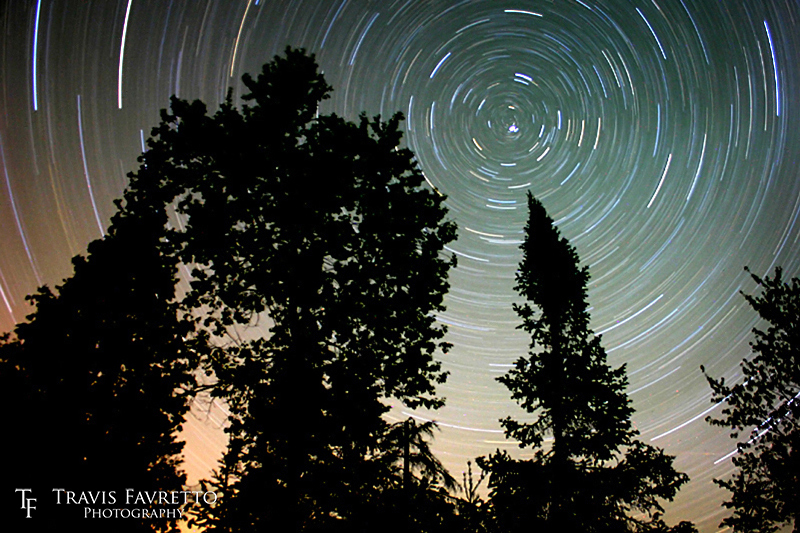 | A 78-minute exposure showing star trails over the trees at a friend's camp at Canoe Point on St. Joseph Island. | Aperture: | f/4.0 | |