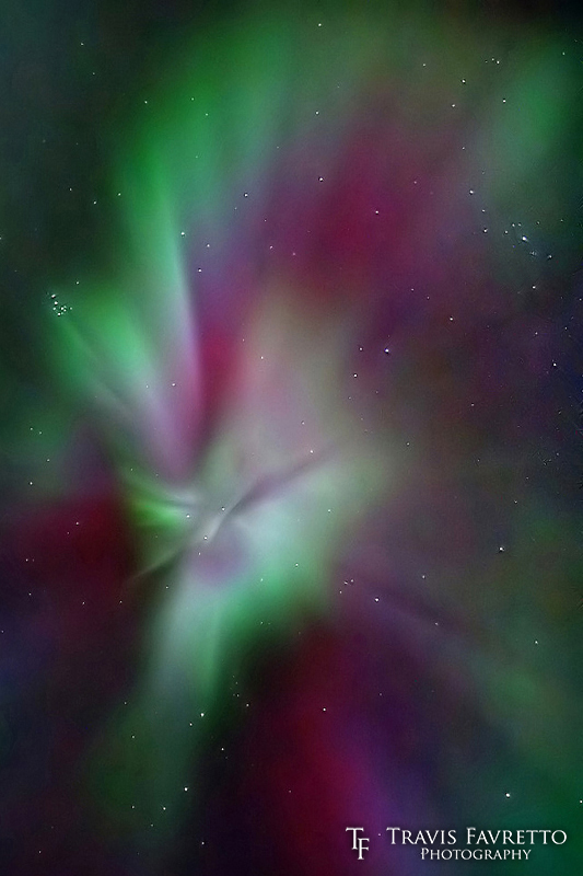 | An M7-class solar flare from Sunspot 696 hurled a coronal mass ejection toward Earth that sparked extremely bright aurora borealis over much of North America during the early morning hours of November 8, 2004. This shot is facing straight up into the sky overhead. | Aperture: | f/2.8 | |