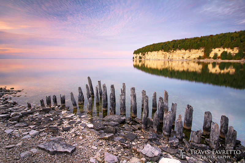 | Remnants of an old dock stick out of the water in Snail Shell Harbor on a calm autumn evening at Fayette Historic State Park, MI. | Aperture: | f/5.6 | |