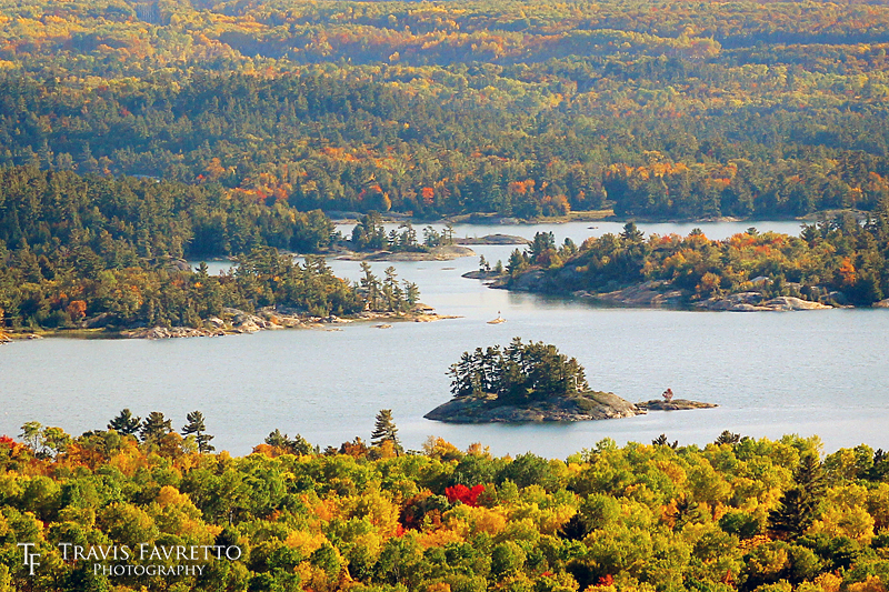 | Fall colours start to show on some small islands at the easternmost tip of Lake Huron's North Channel, as seen from the top of Willisville Mountain between Espanola & Little Current, ON. | Aperture: | f/7.1 | |