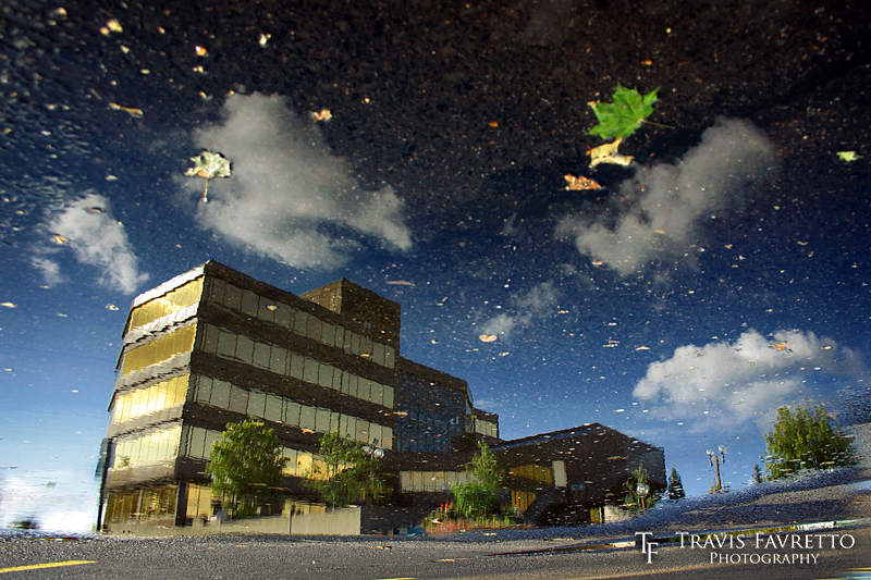 | Sault Ste. Marie's City Hall (Civic Centre) reflected in a puddle after the clouds had broken following some heavy rainfall. | Aperture: | f/5.6 | |