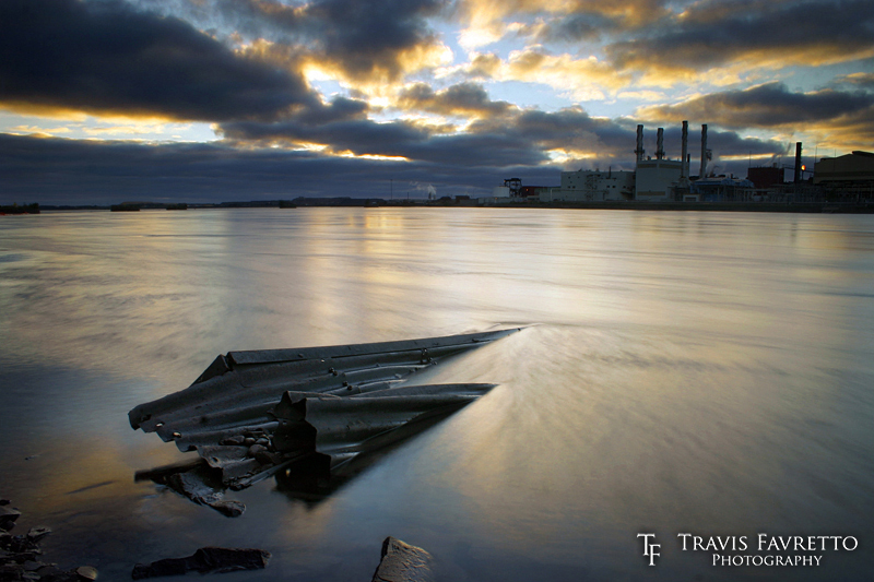 | A large piece of corrugated metal sits partially submerged in the St Marys River with Essar Steel in the background, as seen from St. Marys Island in Sault Ste. Marie, ON. | Aperture: | f/22.0 | |
