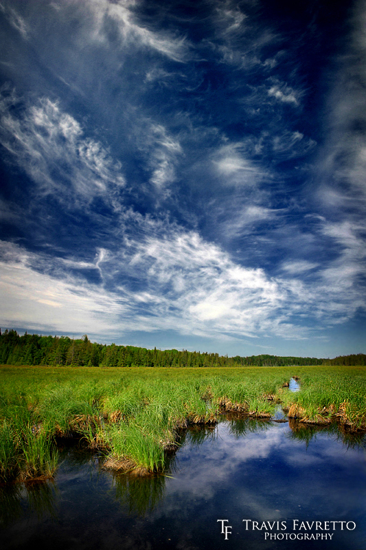 | Intricate, wispy cirrus clouds paint the sky over a marsh along Centre Line Road, roughly 6 km north of Bruce Mines, ON. This is a series of three horizontal shots stitched together vertically. | Aperture: | f/5.6 | |